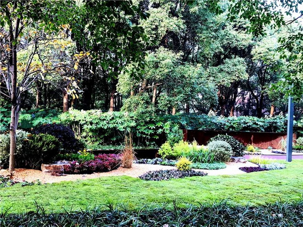 绿地秉承以人为本的设计理念,通过园路与街景结合串联,形成回环曲折的空间变化,展现多样性的城市街景景观。园内设有观赏性的紫藤连廊,营造以紫藤为主题的特色花园,并种植了榔榆、樱花、海棠等色叶及开花乔灌木,呈现自然、缤纷、多彩的植物园林景色。同时设有曲水广场、晨曦广场等特色游憩空间,为人们提供一个健康绿色的活动空间。